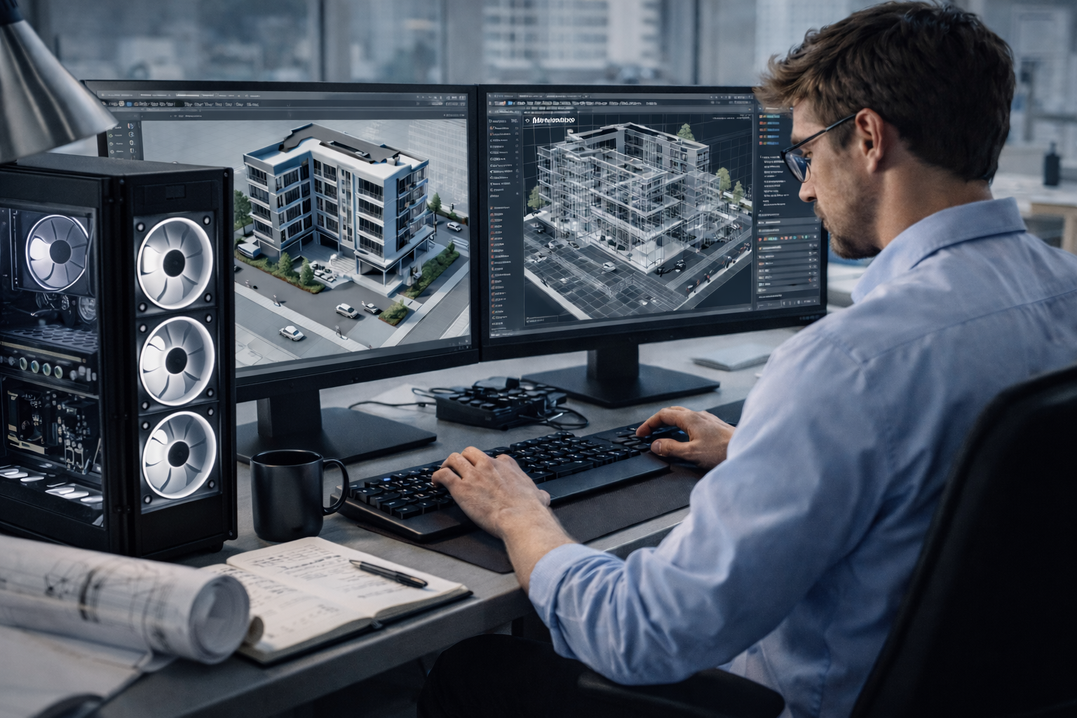 En MyPc Pro diseñamos equipos a medida para entornos de arquitectura y diseño profesional, optimizados para trabajar con software como AutoCAD, Revit, Archicad, SketchUp, Rhino, Lumion o V–Ray, garantizando fluidez tanto en el trabajo diario como en procesos de visualización y render.