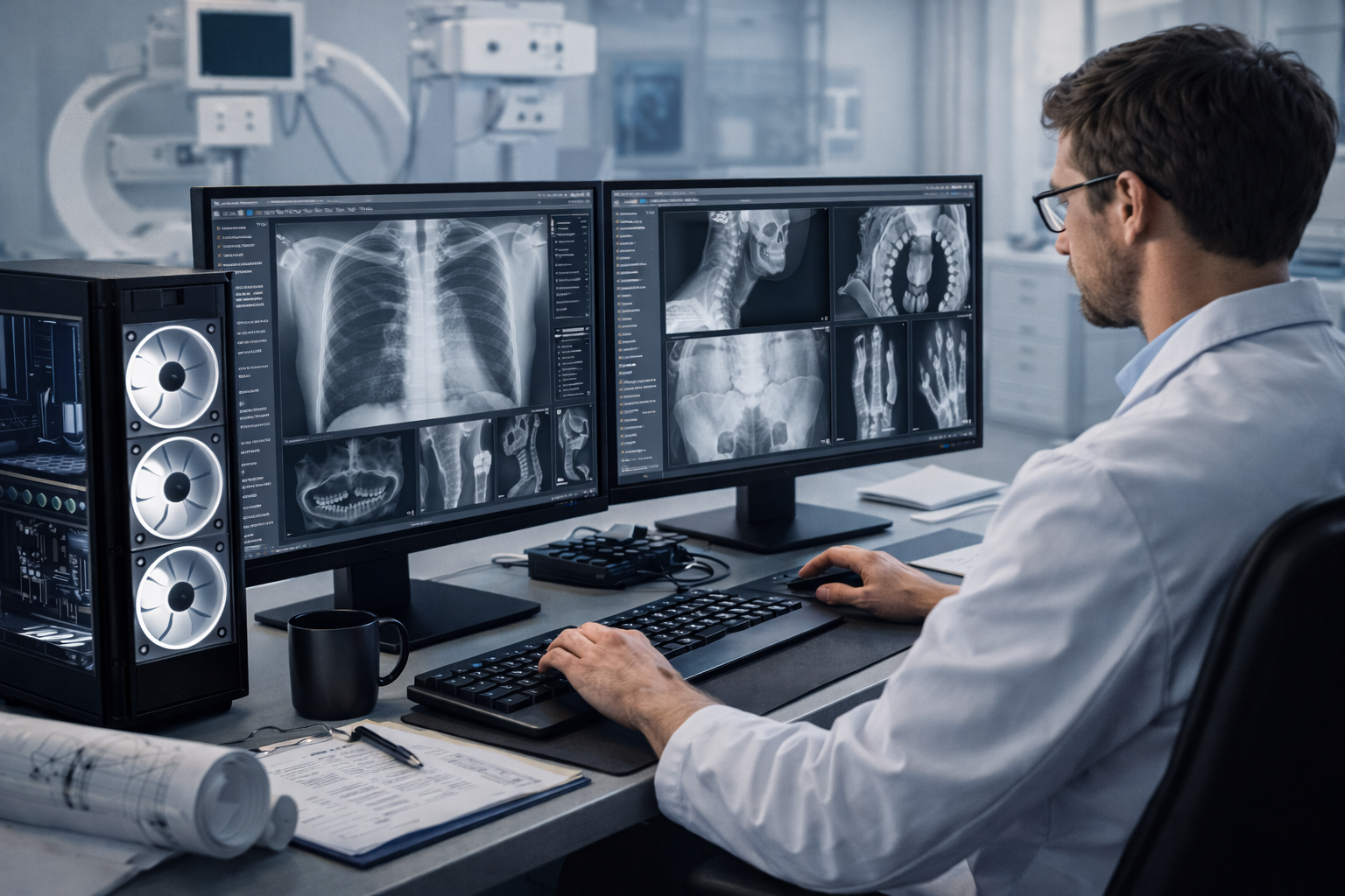En MyPc Pro diseñamos equipos a medida para entornos de radiología y diagnóstico por imagen, optimizados para trabajar con software de imagen médica, sistemas PACS, visores DICOM y aplicaciones de análisis radiológico, garantizando un rendimiento fluido y una representación visual precisa en el trabajo clínico diario.