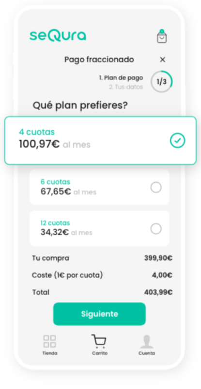 - Elige seQura como método de pago y selecciona la cantidad de cuotas al finalizar tu pedido.