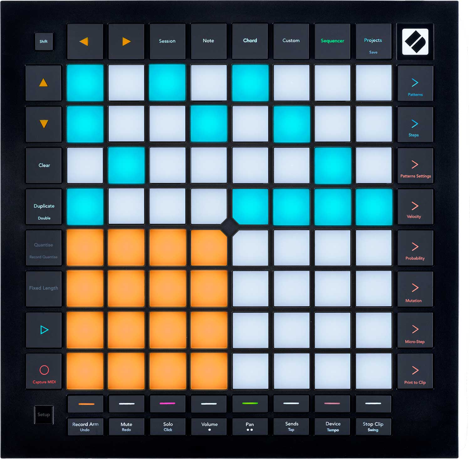 CONTROLADOR PAD DAW ‘. Controlador de cuadrícula para Ableton Live. La integración total con Ableton. 64 grandes pads RGB supersensibles a la presión y la velocidad de pulsación, que reflejan perfectamente de tu sesión de Ableton Live. Potente secuenciador de 4 pistas y 32 pasos, con 8 motas de polifonía, encadenamiento de patrones y escenas y controles de probabilidad y mutación. Modo de acordes y modos dinámicos de Nota y Escala para interpretar sin esfuerzo líneas de bajo, melodías, acordes y partes solistas perfectamente a tono. Carga automática de racks de batería en la cuadrícula. MIDI In, Out y Thru. Acceso desde la unidad a la función Capturar MIDI de Ableton Live. 8 modos personalizados usando Novation Components. Elegante, ligero y resistente y alimentado por USB-C. Herramienta de puesta en marcha fácil y video guías paso-a-paso para empezar a hacer música en cuestión de minutos. Garantía Novation de 2 años. Incluye Ableton Live Lite, dos meses de membresía a Splice Sounds, Pack de sintes virtuales AAS Session, teclado virtual de XLN Addictive Keys, plugins de efectos R0Verb y DAW Cassette de Klevgrand, pack de plugins Time and Tone de Softube y acceso a la plataforma Sound Collective.