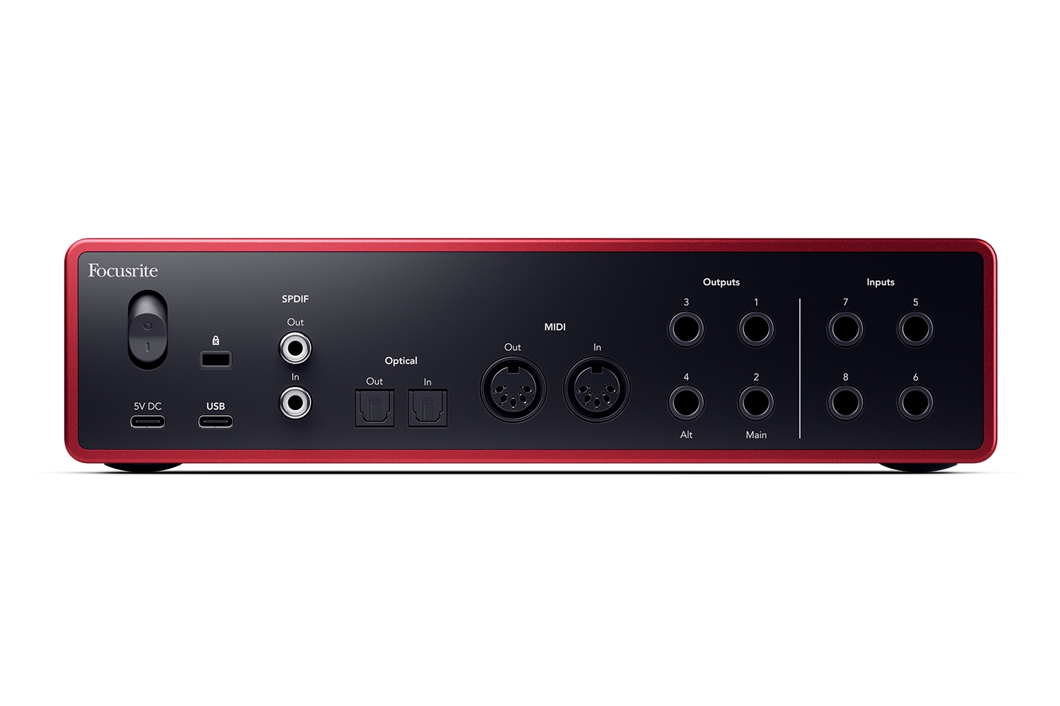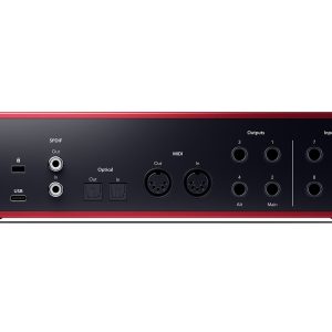 18 entradas y 16 salidas, incluyendo cuatro preamplificadores de micrófono, E/S MIDI, de línea y para instrumentos